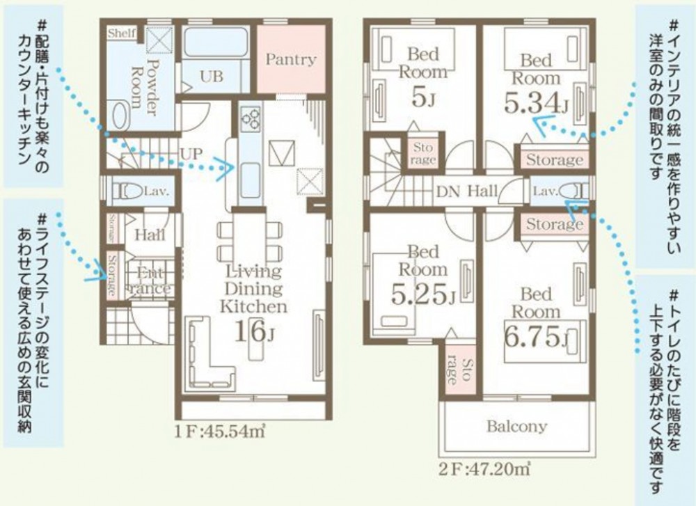 - システムキッチン、カウンターキッチン、シャンプードレッサー、洗浄便座、浴室乾燥機、複層ガラス、モニタ付インターホン、駐車場2台分、床下収納、トイレ2箇所