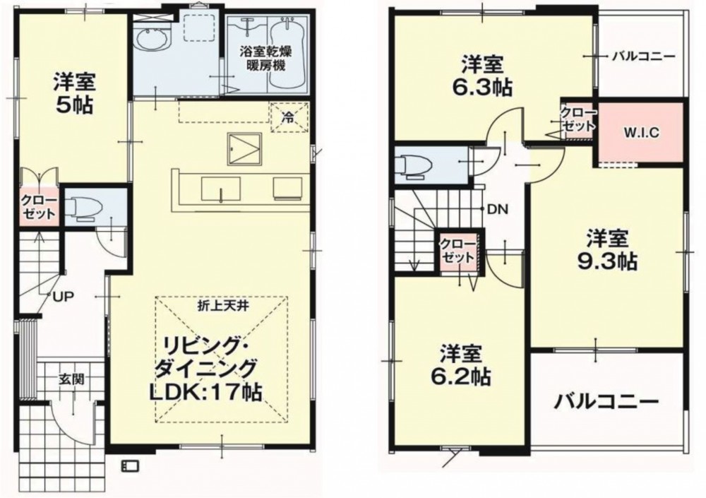 - システムキッチン、カウンターキッチン、食器洗浄乾燥機、IHクッキングヒーター、オール電化、シャンプードレッサー、洗浄便座、浴室乾燥機、複層ガラス、モニタ付インターホン、駐車場2台分、床下収納、トイレ2箇所