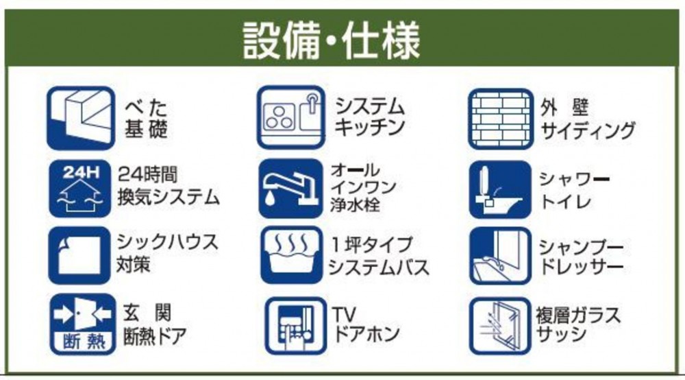 - システムキッチン、カウンターキッチン、シャンプードレッサー、洗浄便座、浴室乾燥機、複層ガラス、モニタ付インターホン、駐車場3台分、床下収納、トイレ2箇所