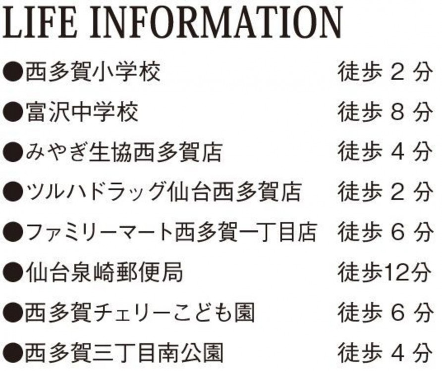 地下鉄南北線「富沢」駅 徒歩18分・西多賀小学校 徒歩2分・富沢中学校 徒歩8分