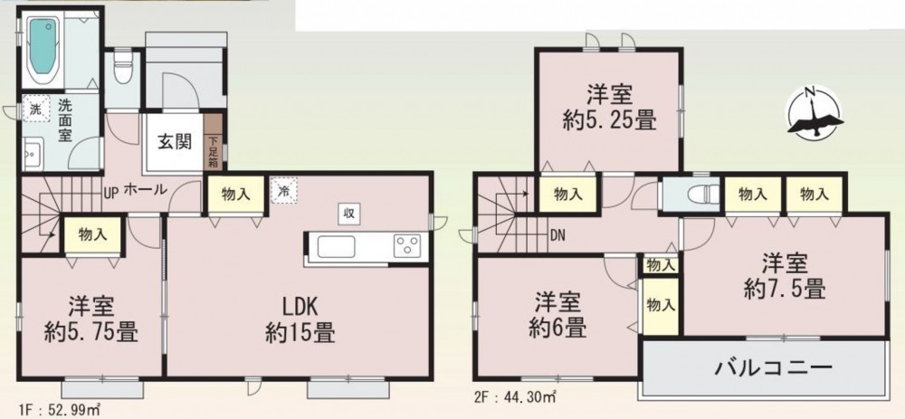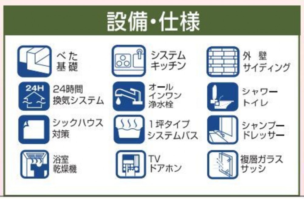 - システムキッチン、カウンターキッチン、シャンプードレッサー、洗浄便座、浴室乾燥機、複層ガラス、モニタ付インターホン、駐車場3台分、床下収納、トイレ2箇所