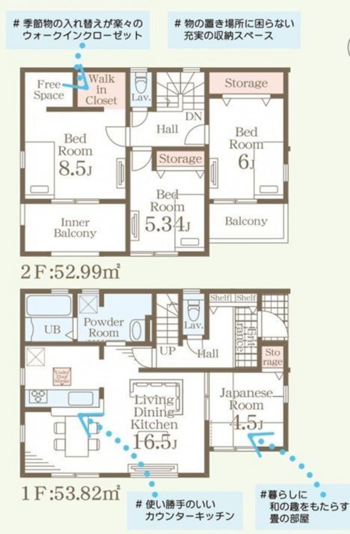 - システムキッチン、カウンターキッチン、シャンプードレッサー、洗浄便座、浴室乾燥機、複層ガラス、モニタ付インターホン、駐車場2台分、床下収納、トイレ2箇所