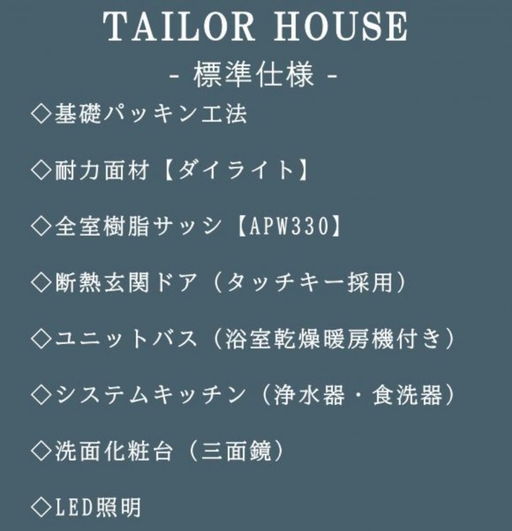 - システムキッチン、カウンターキッチン、食器洗浄乾燥機、IHクッキングヒーター、オール電化、シャンプードレッサー、洗浄便座、浴室乾燥機、複層ガラス、モニタ付インターホン、床下収納、トイレ2箇所