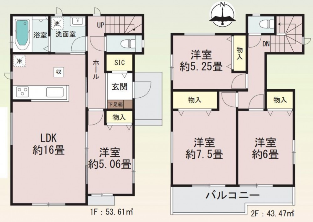 - システムキッチン、カウンターキッチン、シャンプードレッサー、洗浄便座、浴室乾燥機、複層ガラス、モニタ付インターホン、駐車場2台分、床下収納、トイレ2箇所