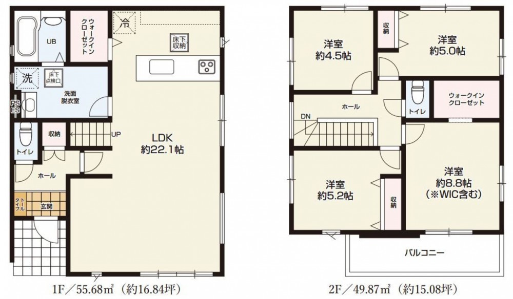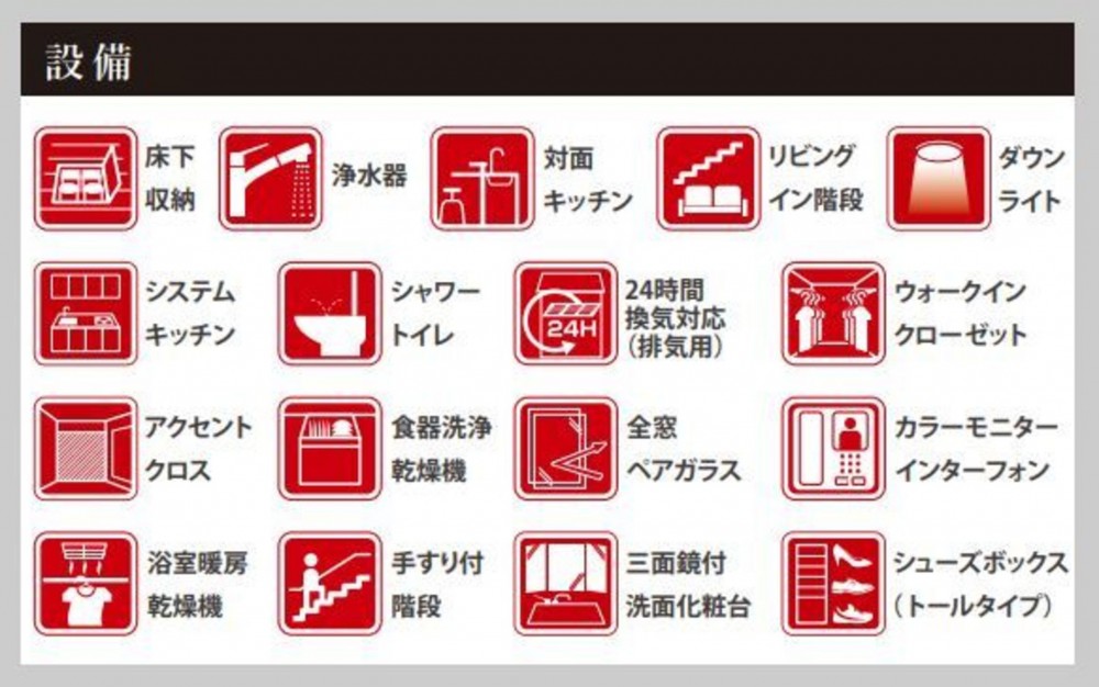 - システムキッチン、カウンターキッチン、食器洗浄乾燥機、IHクッキングヒーター、オール電化、シャンプードレッサー、洗浄便座、浴室乾燥機、複層ガラス、モニタ付インターホン、駐車場2台分、床下収納、トイレ2箇所