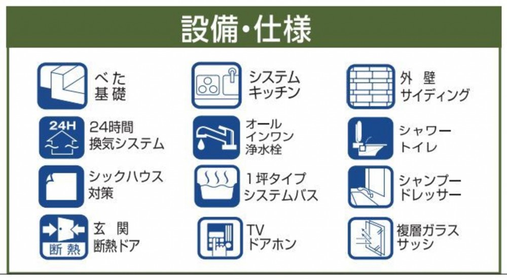 - システムキッチン、カウンターキッチン、シャンプードレッサー、洗浄便座、浴室乾燥機、複層ガラス、モニタ付インターホン、駐車場2台分、床下収納、トイレ2箇所
