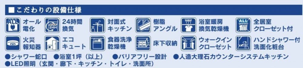 - システムキッチン、カウンターキッチン、食器洗浄乾燥機、IHクッキングヒーター、オール電化、シャンプードレッサー、洗浄便座、浴室乾燥機、モニタ付インターホン、駐車場2台分、床下収納、エコキュート、トイレ2箇所