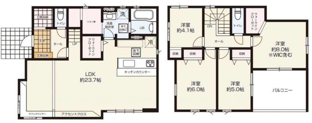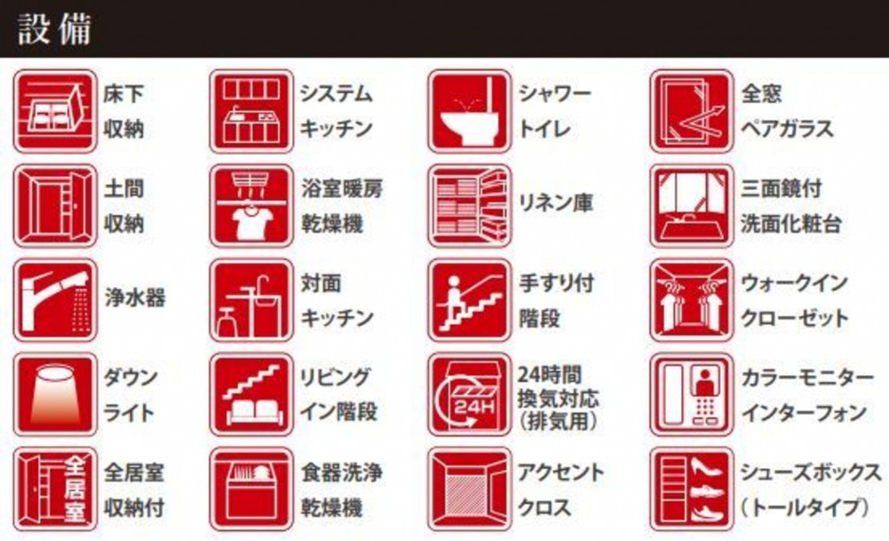 - システムキッチン、カウンターキッチン、食器洗浄乾燥機、IHクッキングヒーター、オール電化、シャンプードレッサー、洗浄便座、浴室乾燥機、複層ガラス、モニタ付インターホン、駐車場2台分、床下収納、トイレ2箇所
