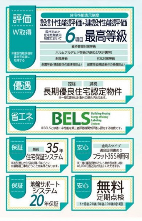 - システムキッチン、カウンターキッチン、シャンプードレッサー、洗浄便座、浴室乾燥機、複層ガラス、モニタ付インターホン、駐車場3台分、床下収納、トイレ2箇所
