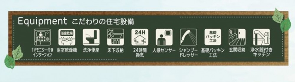 - システムキッチン、カウンターキッチン、シャンプードレッサー、洗浄便座、浴室乾燥機、複層ガラス、モニタ付インターホン、床下収納、トイレ2箇所