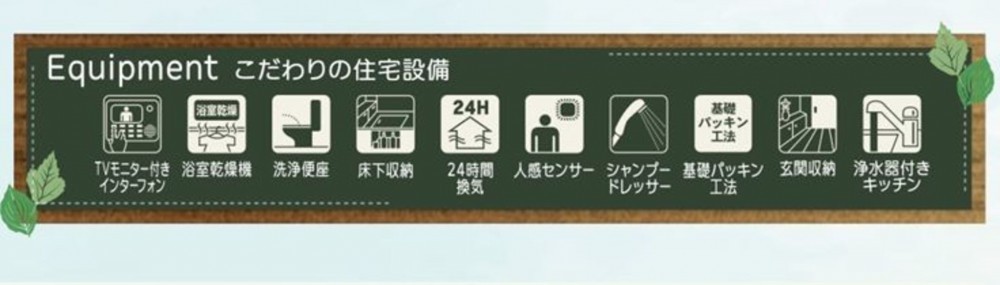 - システムキッチン、カウンターキッチン、IHクッキングヒーター、オール電化、シャンプードレッサー、洗浄便座、浴室乾燥機、複層ガラス、モニタ付インターホン、床下収納、トイレ2箇所